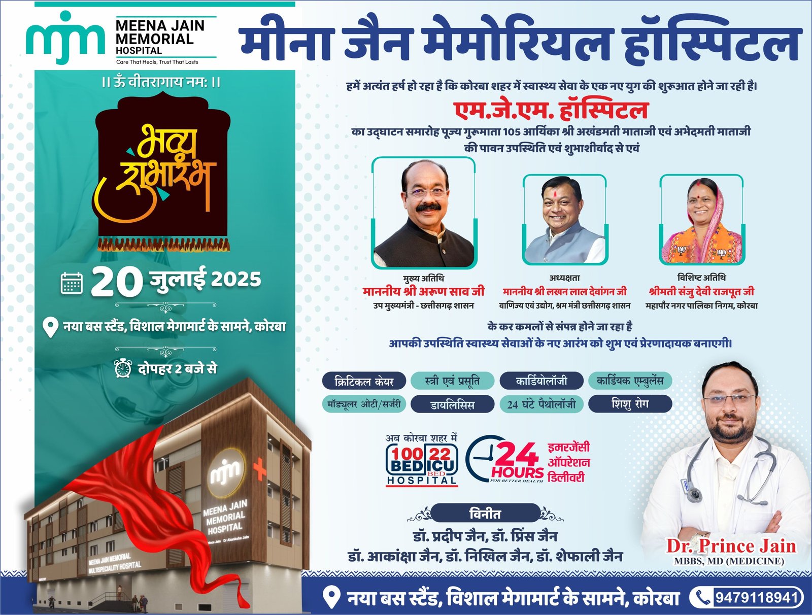 *कोरबा को मिला अपना ‘एम्स’, मीना जैन मेमोरियल हॉस्पिटल से स्वास्थ्य सेवाओं में ऐतिहासिक क्रांति,100 बेड, 22 ICU, 24×7 सेवा — रायपुर से बेहतर इलाज अब आधे खर्च में यहीं,डॉ. प्रिंस जैन के नेतृत्व में मिलेगा विशेषज्ञ इलाज, हर वर्ग के लिए सुलभ*
