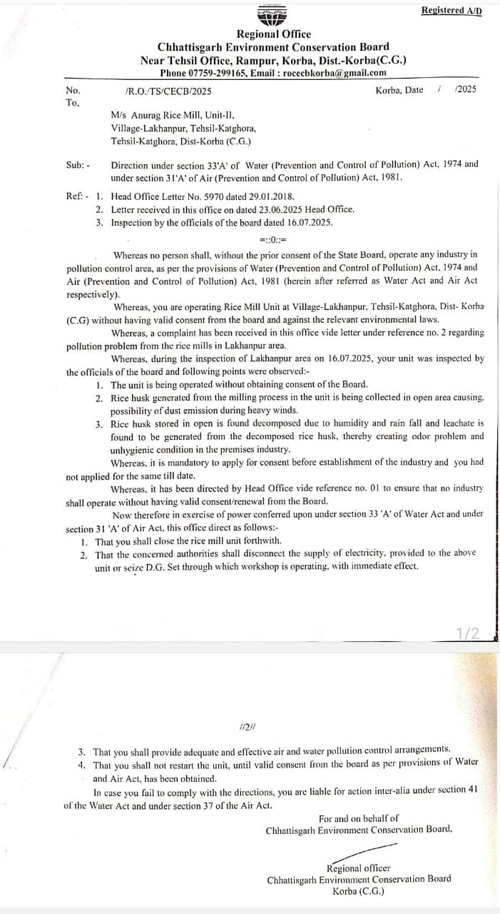 लखनपुर ग्राम में चावल मिलों द्वारा की जा रही प्रदूषण की शिकायत के संबंध में छत्तीसगढ़ पर्यावरण संरक्षण मंडल द्वारा दिनांक 16/07/2025 को निरीक्षण किया गया। निरीक्षण के दौरान पाया गया कि मेसर्स अनुराग राइस मिल यूनिट-2, ग्राम लखनपुर तहसील कटघोरा,में बिना वैध संचालन सम्मति (consent to Operate) के औद्योगिक गतिविधियाँ संचालित की जा रही थीं।