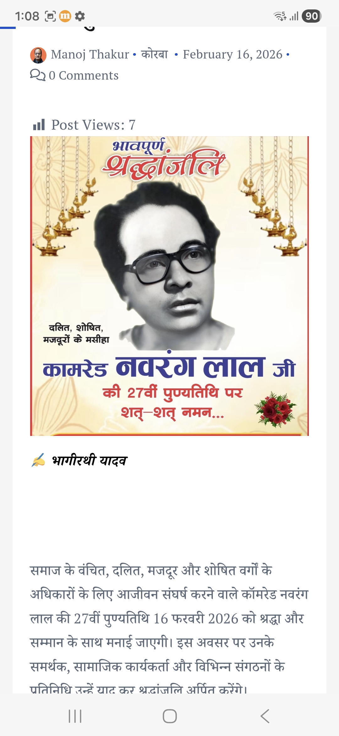 समाज के वंचित, दलित, मजदूर और शोषित वर्गों के अधिकारों के लिए आजीवन संघर्ष करने वाले कॉमरेड नवरंग लाल की 27वीं पुण्यतिथि 16 फरवरी 2026 को श्रद्धा और सम्मान के साथ मनाई जाएगी। इस अवसर पर उनके समर्थक, सामाजिक कार्यकर्ता और विभिन्न संगठनों के प्रतिनिधि उन्हें याद कर विनम्रता पूर्वक श्रद्धांजलि अर्पित करेंगे।