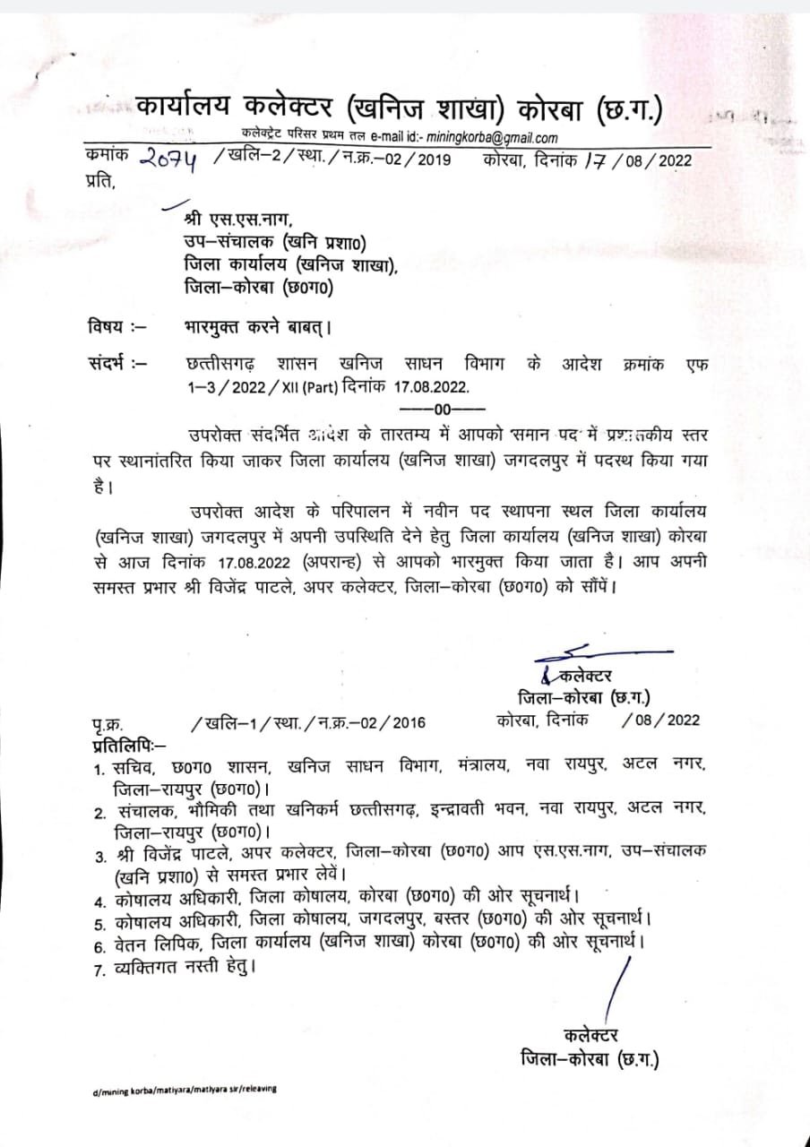 *उप संचालक खनिज प्रशासन श्री एस एस नाग नए पदस्थापना स्थल के लिए हुए भारमुक्त*