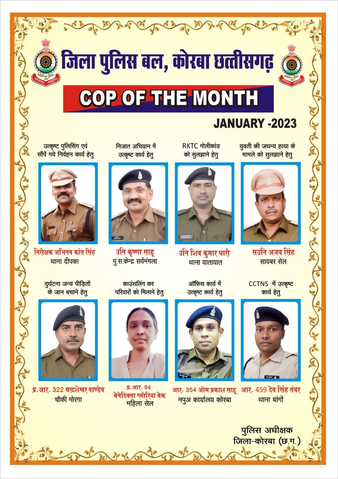 माह जनवरी 2023 में बेसिक, सामुदायिक एवं अन्य क्षेत्रों में अच्छा कार्य करने वाले निरीक्षक अभिनव कांत सिंह, उपनिरीक्षक कृष्णा साहू, उपनिरीक्षक शिवकुमार धारी, सहायक उपनिरीक्षक अजय सिंह, प्रधान आरक्षक चंद्रशेखर पांडेय,महिला प्रधान आरक्षक वेनेदिकता ग्लोरिया बेक, आरक्षक ओम प्रकाश साहू एवं आरक्षक देव सिंह तंवर को पुरस्कृत किया गया है ।